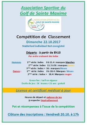 Compétition de Classement – Dimanche 22.10.2017 – Stableford individuel Net enregistré Départs : à partir de 8h10, par ordre croissant des index Hommes 1ère série : index de 0 à 11.4 marques blanches …